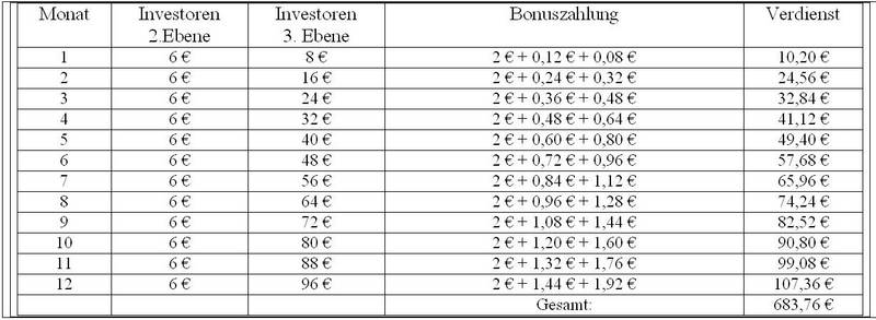 Investoren (je 100 €) pro Monat , welche wiederum 2 neue Investoren werben
