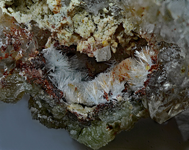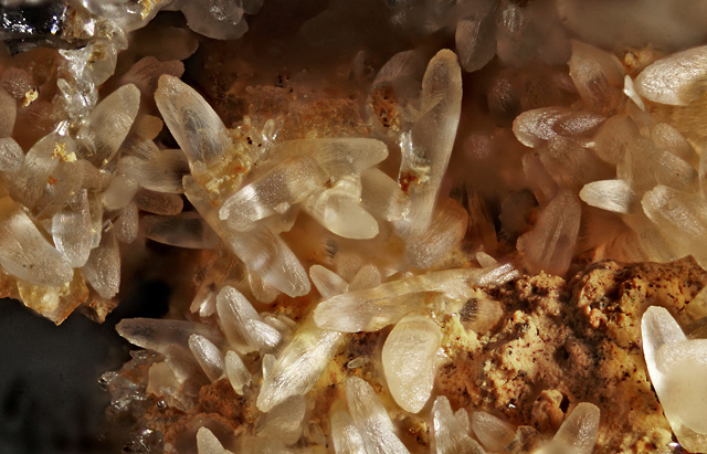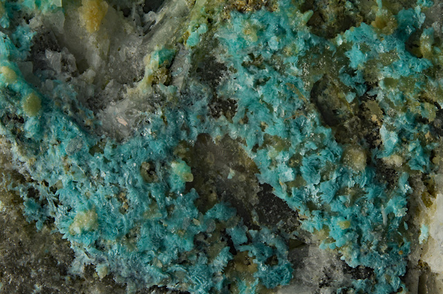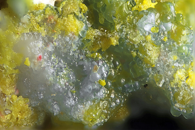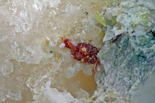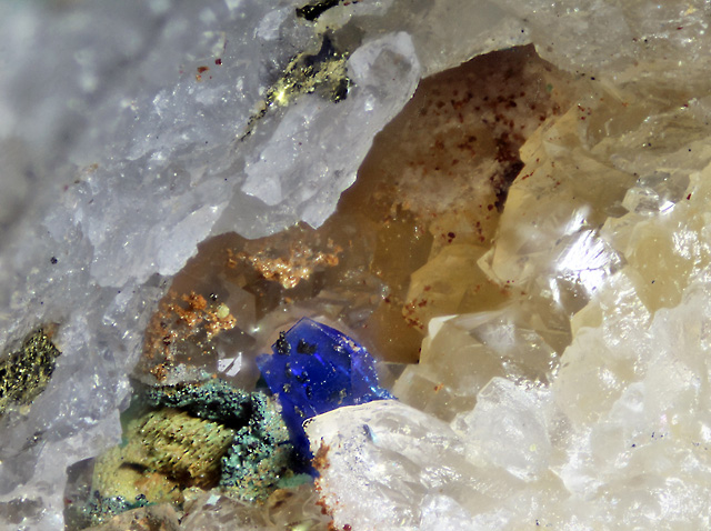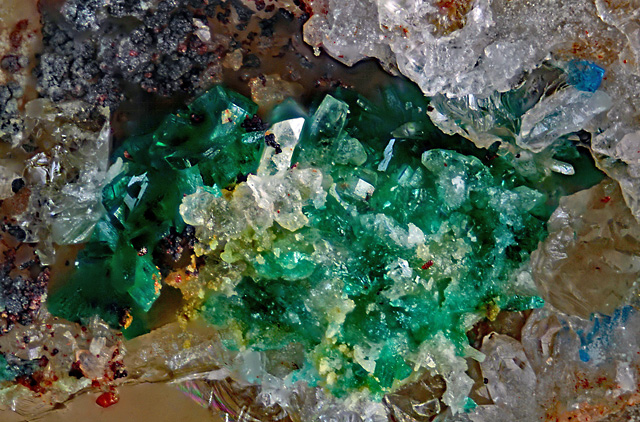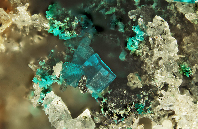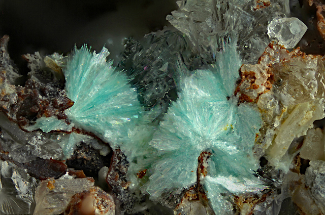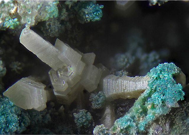 | Hyalit | SiO2 | X | Calcit | CaCO3 | X | Caledonit | Pb5Cu2(CO3)(SO4)3(OH)6 | X | ||