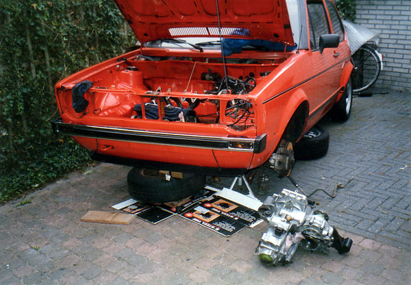 It is a GTI with a 112 HP engine with K-Jetronic, and there is a special exhaust system mounted with special manifold. Also most interior parts have been taken out, and will be replaced with 2 Sparco Pro 2000 seats.