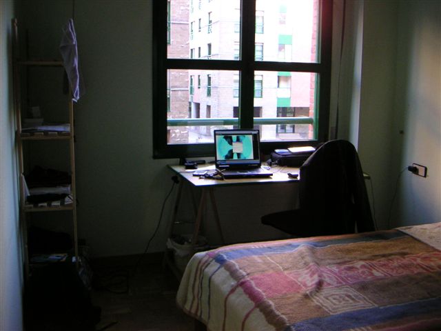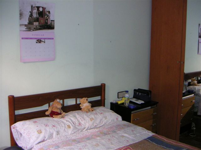 | Mein Zimmer mit Aussicht auf den Innenhof, wo sich an schönen Tagen alte Leute (oder auch ich) auf die Bänke setzen. | Hier noch der Rest des Zimmers (mit Spiegelkasten!) |