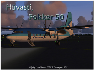 Hüvasti, Fokker50 (FS04) (*mit Lauri Koost) Länge: 2:21 Dateigrösse: 5.5MB Musik: Langsame Pianomusik Maschine: Dreamwings Fokker50 Estonian Air Zeigt: Auf Wunsch eines estischen Kollegen* ist dieses Abschiedsvideo für die am 24.10.03 ausgemusterte Fokker50 der Estonian Air entstanden. Zeigt sie auf einem Abendflug zwischen Pärnu und Tallin wiederum unterstützt von melancholischer Klaviermusik. -Download- | |||||||||||||||||||||||||||||||||||||||||||||||||||||||||||||||||||||