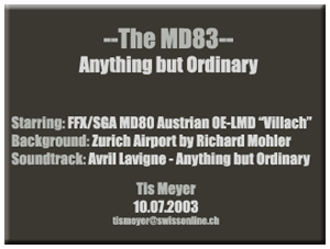 The MD83 - Anything but Ordinary (FS02) Länge: 1:52 Dateigrösse: 4.5MB Musik: Avril Lavigne - Anything but Ordinary Maschine: FFX/SGA Md80 Austrian Airlines Zeigt: Mein erstes Video überhaupt. Trotzdem denke ich kann es sich sehen lassen. Es zeigt die MD80 in einem kurzen Rundflug mit Start und Landung in Zürich, musikalisch passend untermauert von Avril Lavigne's Song "Anything but Ordinary" -Download- | |||||||||||||||||||||||||||||||||||||||||||||||||||||||||||||||||||||